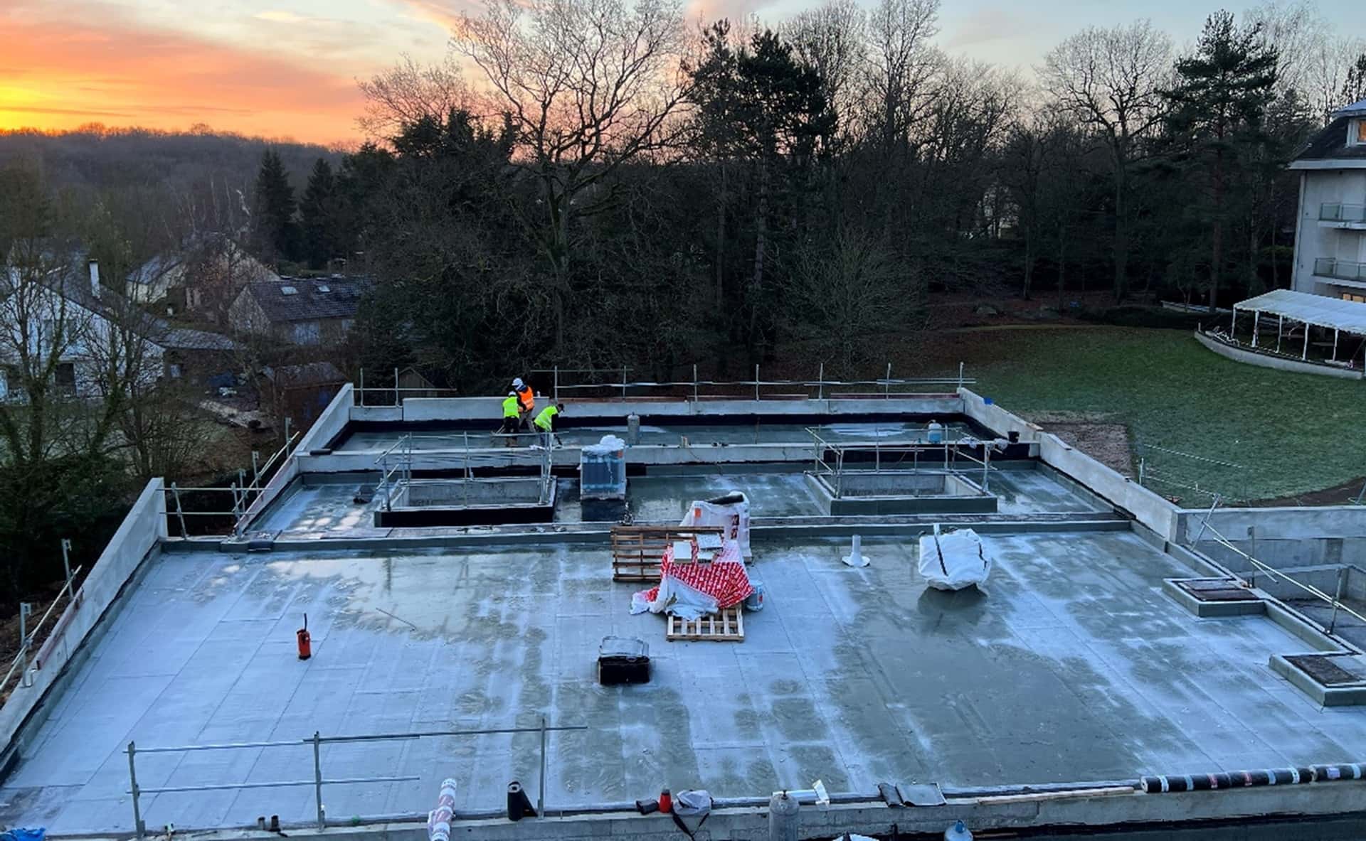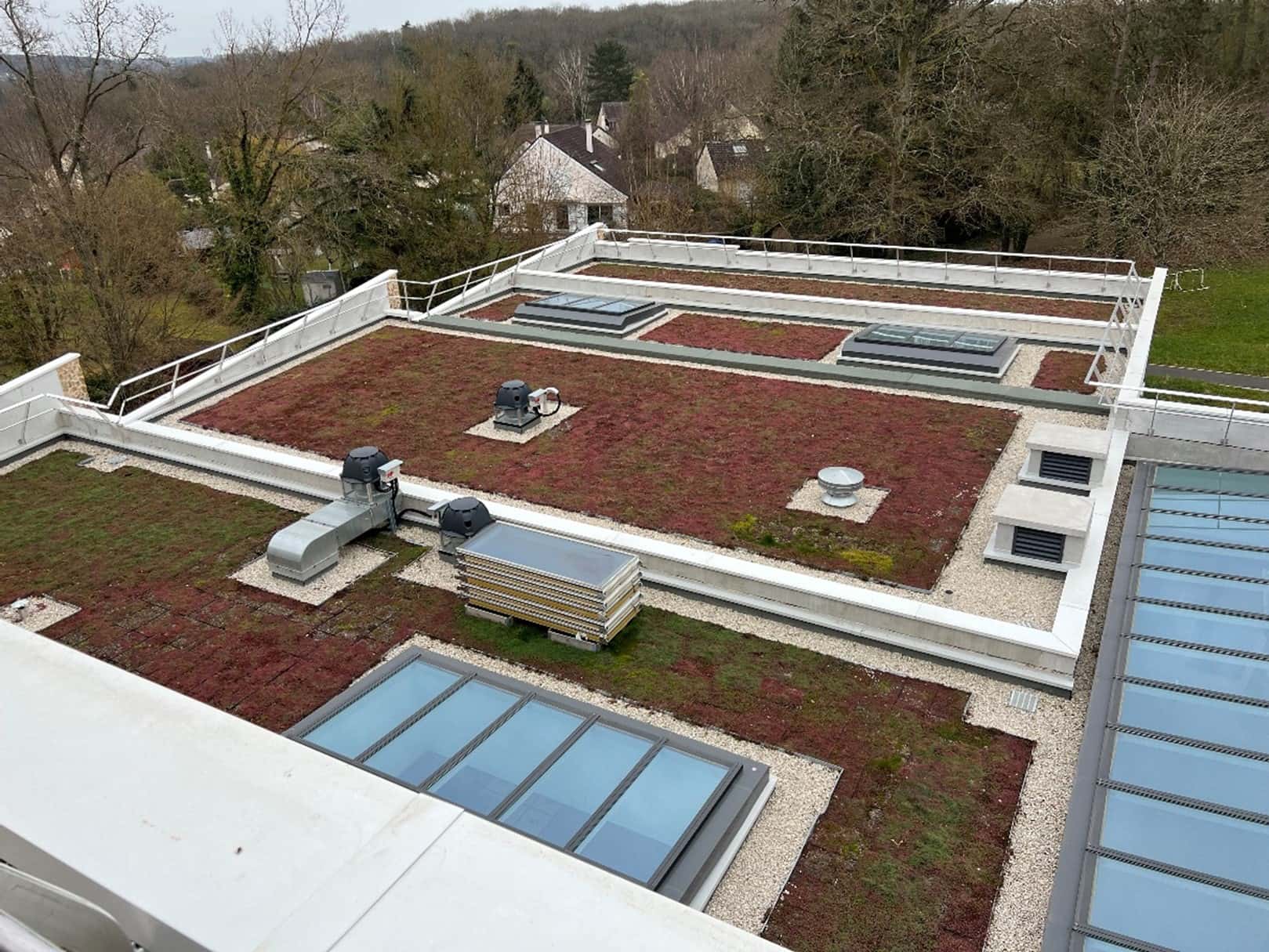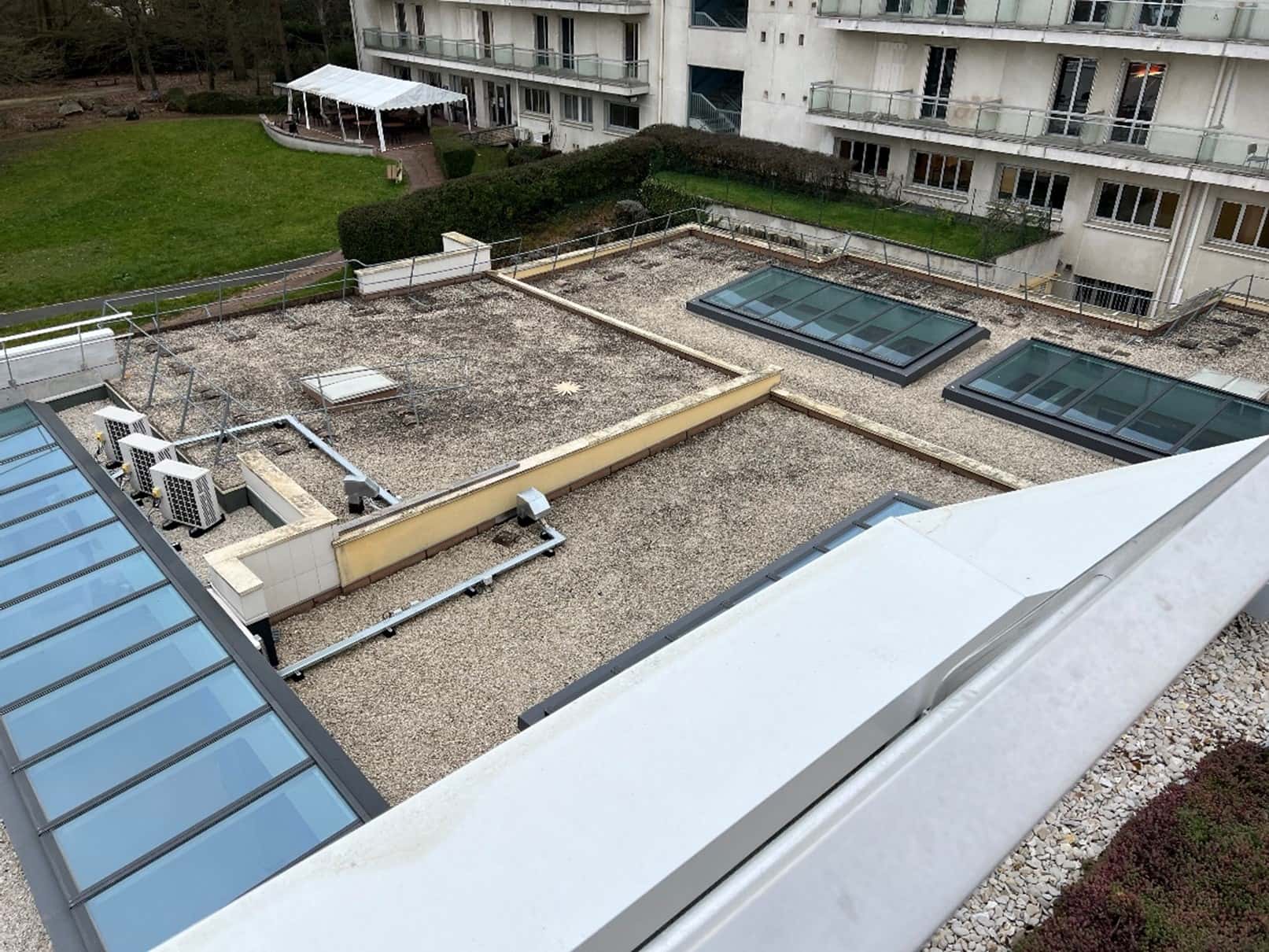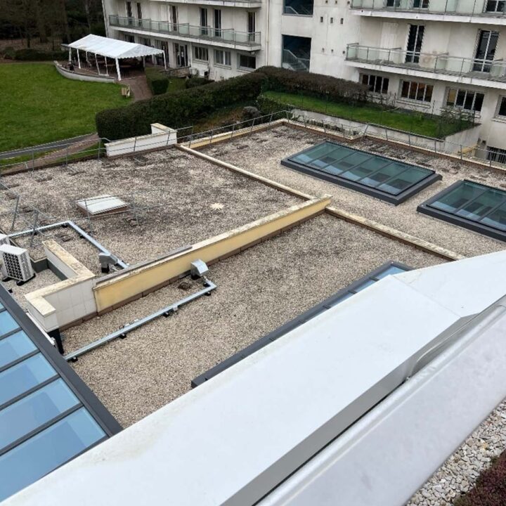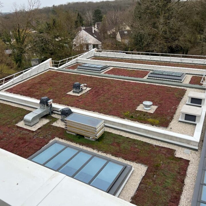 Les travaux ont été menés à bien, assurant une étanchéité optimale et une finition soignée. Les complexes d’étanchéité isolés ont été mis en œuvre sur support béton, garantissant la protection et la pérennité des structures. Les toitures terrasses ont été aménagées selon leur usage : certaines sont désormais circulables et protégées par des dalles en béton, tandis que d’autres ont été végétalisées à l’aide de bacs pré-cultivés, apportant une isolation naturelle et une intégration paysagère harmonieuse.